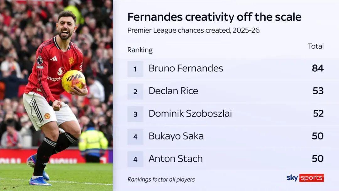 天空体育:本赛季至今,B费在英超联赛中创造84次机会,是所有球员中最多的,第2名的赖斯共创造53次机会。